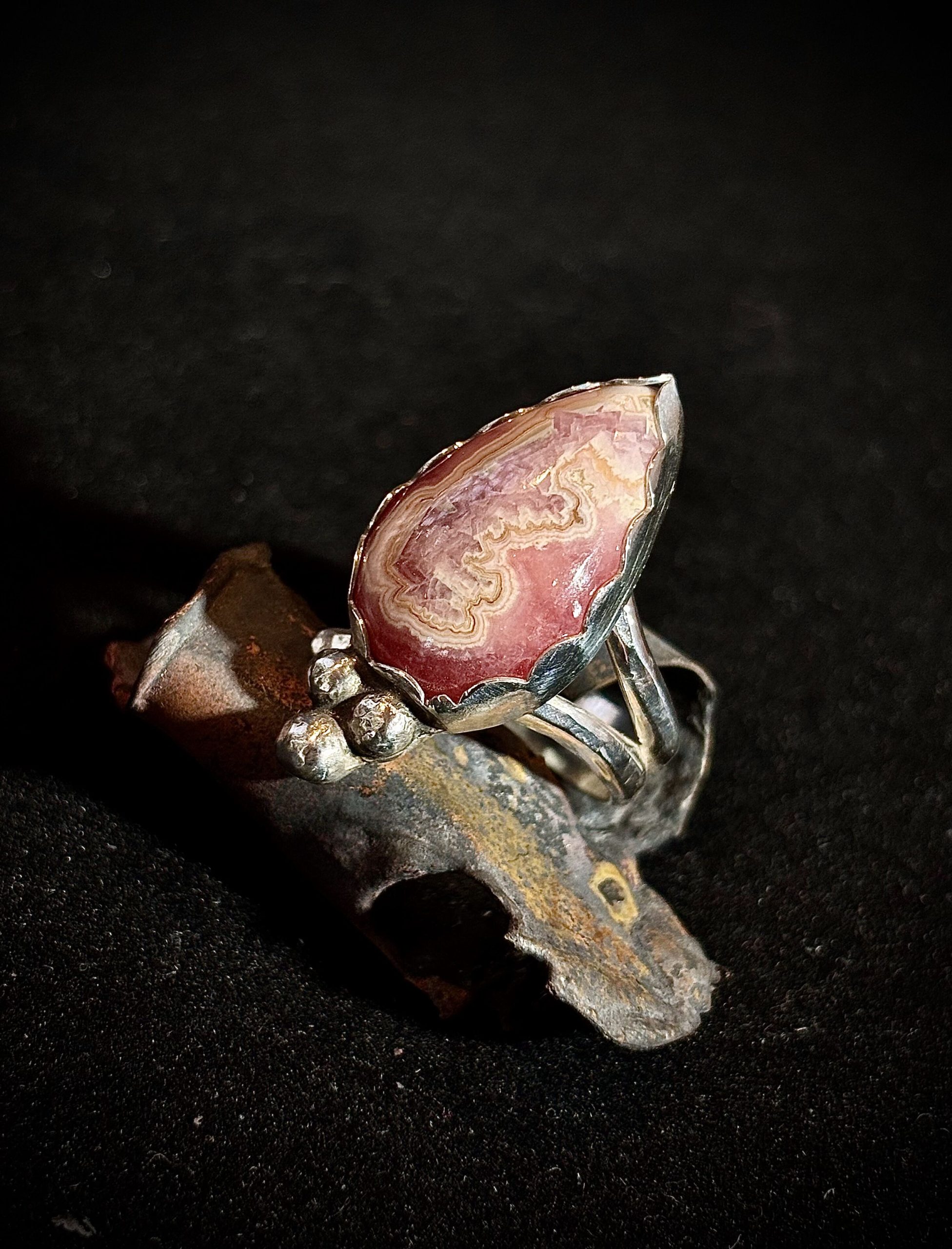 Rhodochrosite stone set in Sterling Silver. Approximately 28mm x 14mm. Sterling band is adjustable, please select size.