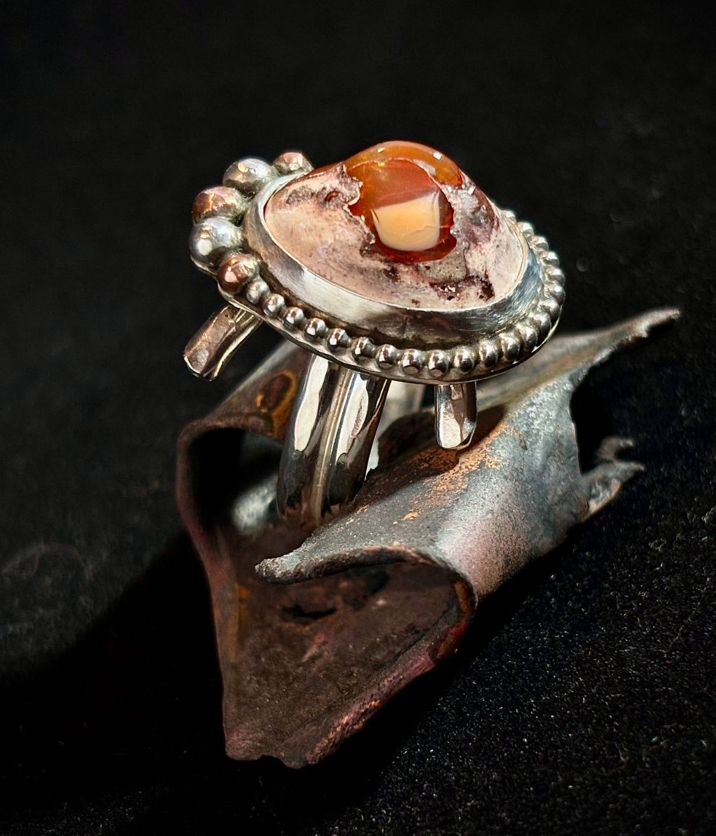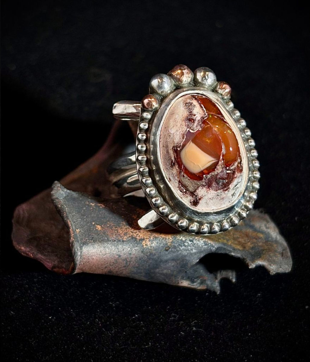 Mexican Fire Opal set in Sterling Silver with Copper accents. Approximately 24mm x 17 mm. Sterling band is adjustable, please select size.