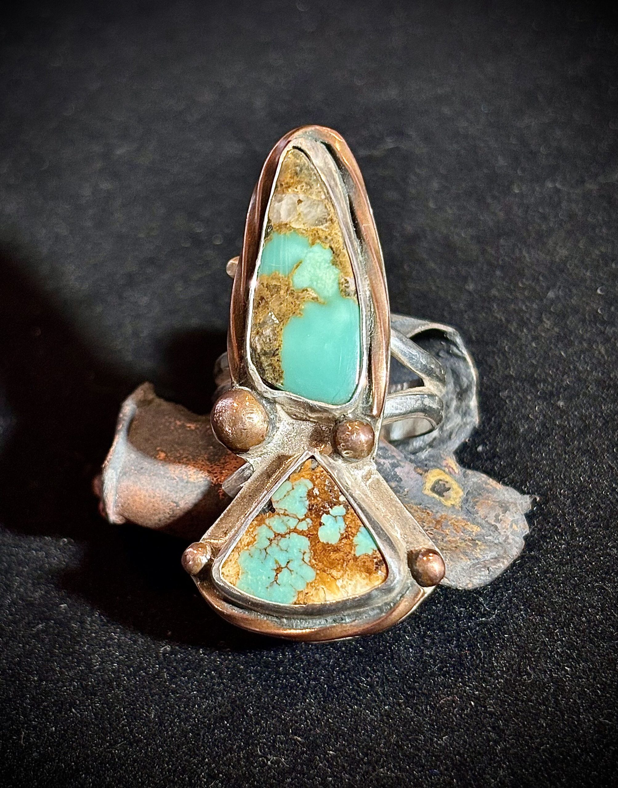 Vintage Turquoise set in Sterling Silver with copper accents. Approximately 41mm x 20mm. Sterling band is adjustable, please select size.