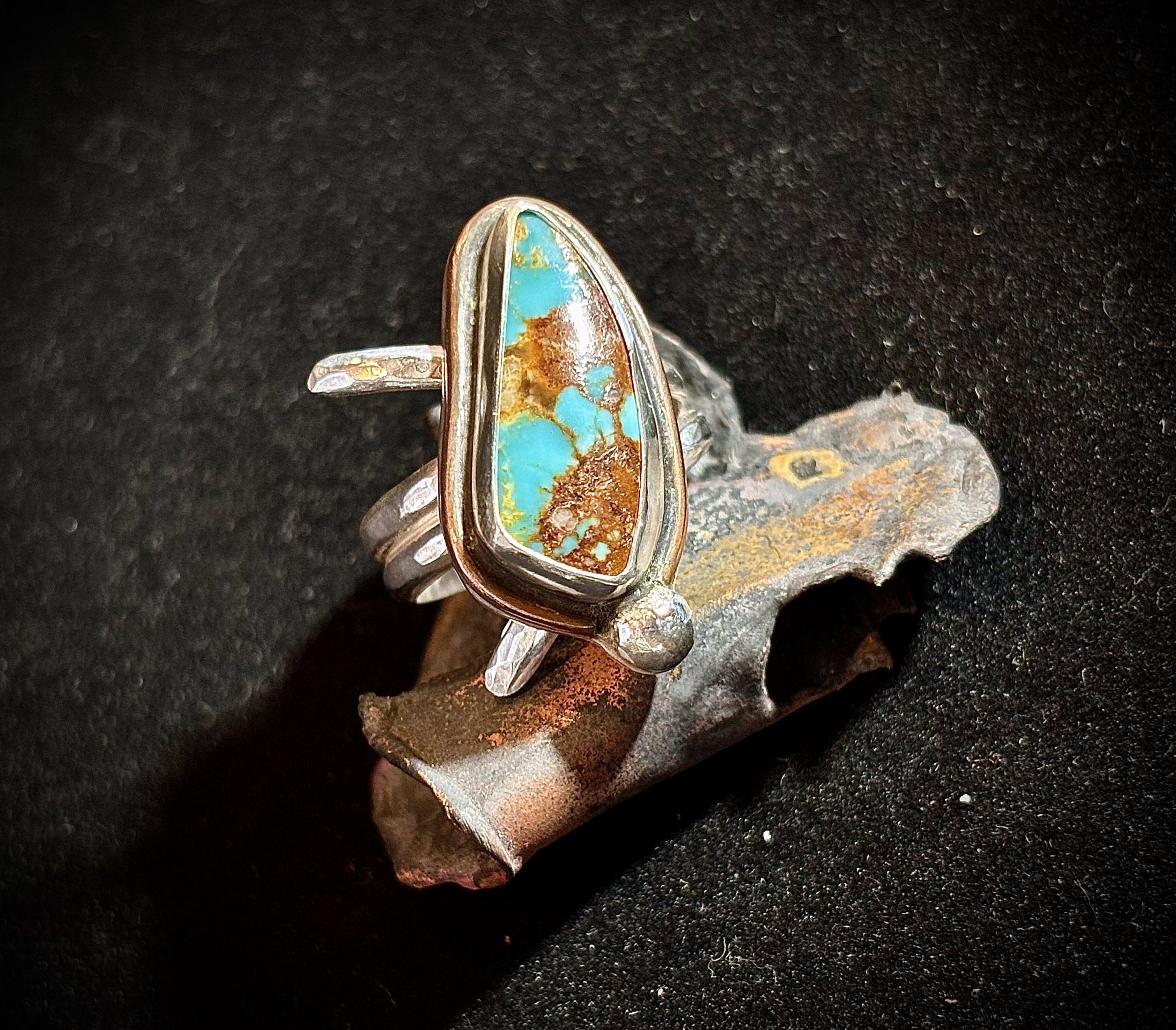 Vintage Turquoise set in Sterling Silver with copper accents. Approximately 26mm x 12mm. Sterling band is adjustable, please select size.