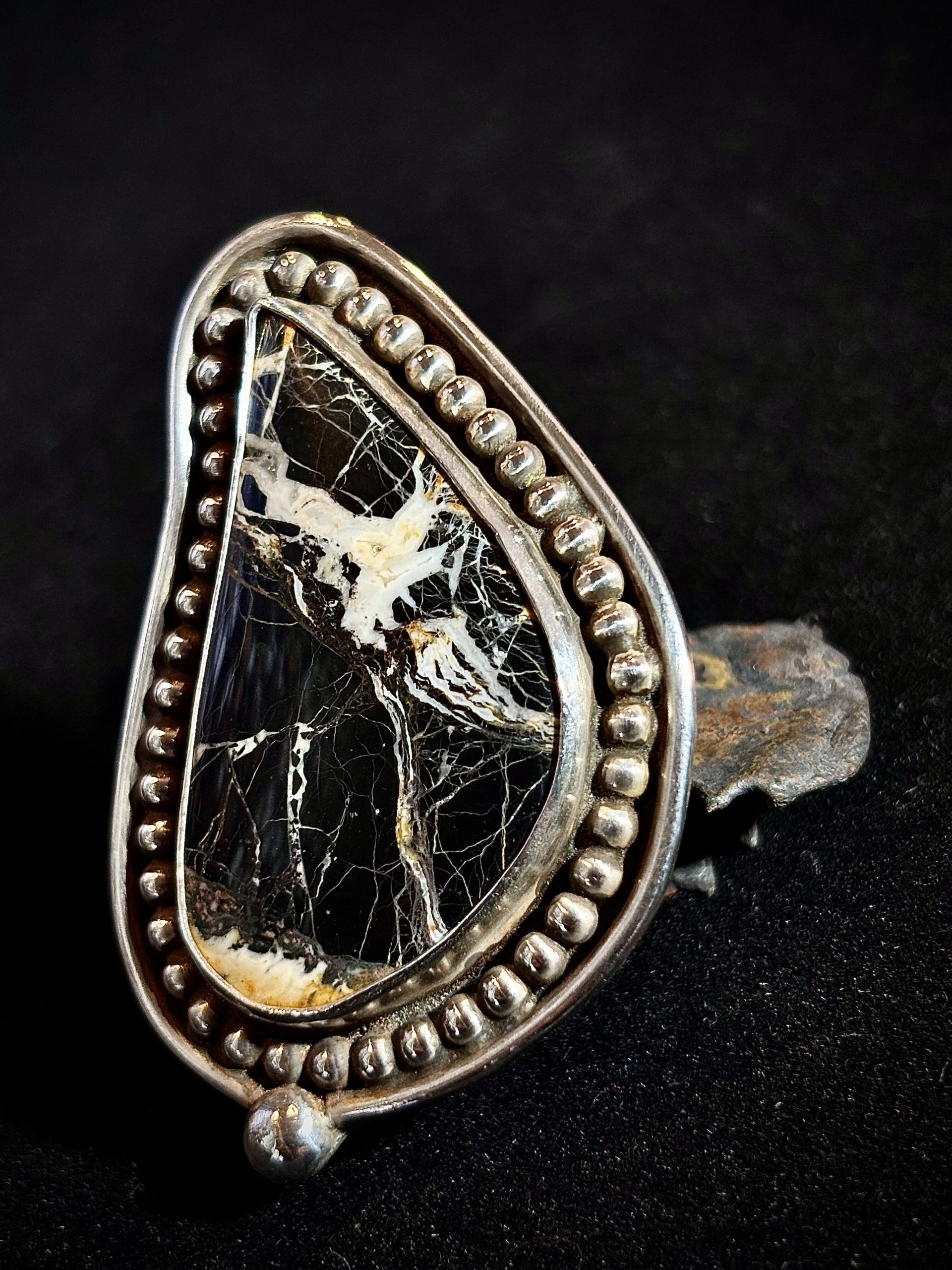 White Buffalo stone set in Sterling Silver. Approximately 43mm x 32mm. Sterling band is adjustable, please select size.