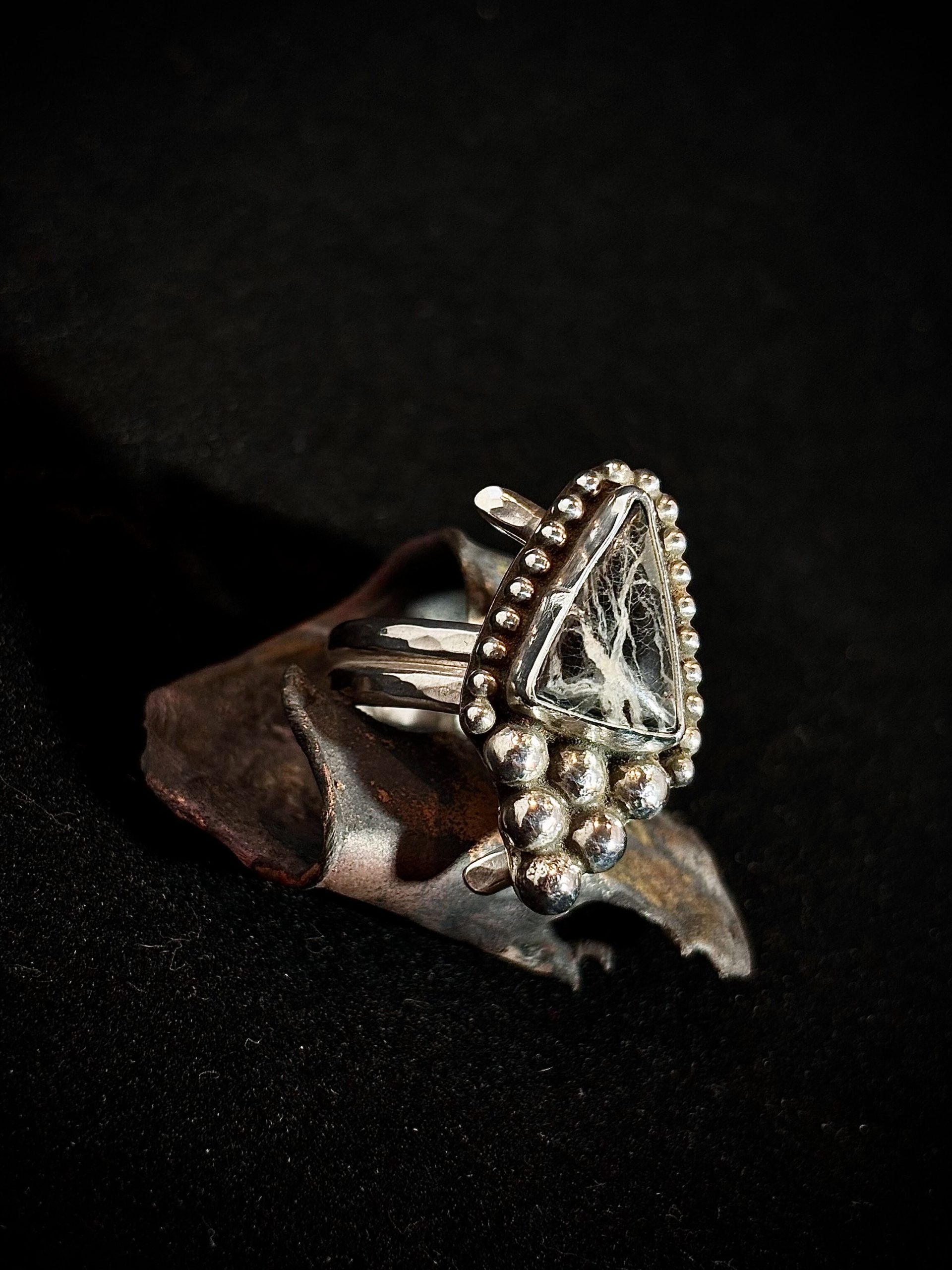 White Buffalo stone set in Sterling Silver. Approximately 26mm x 14mm. Sterling band is adjustable, please select size.