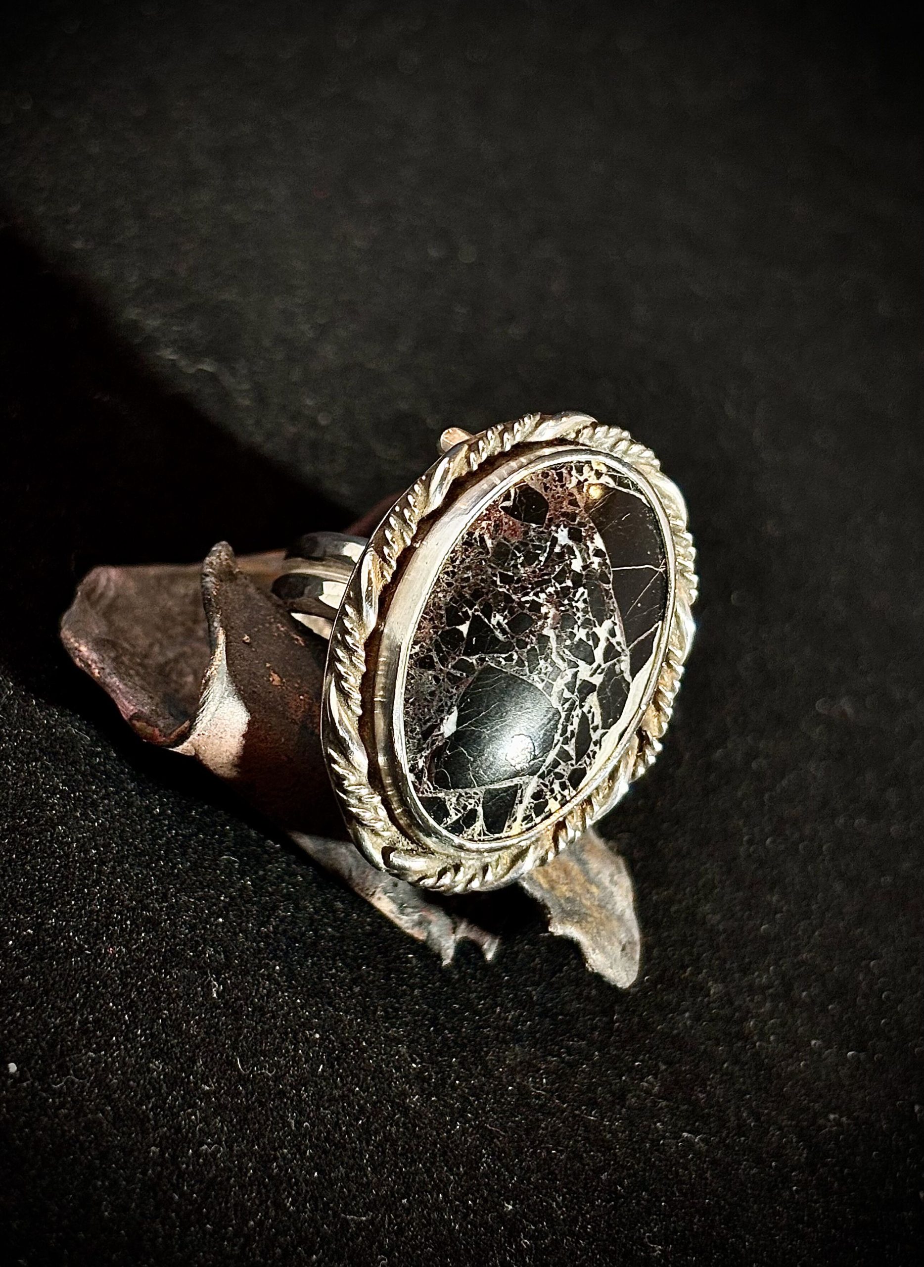 White Buffalo stone set in Sterling Silver. Approximately 29mm x 21mm. Sterling band is adjustable, please select size.