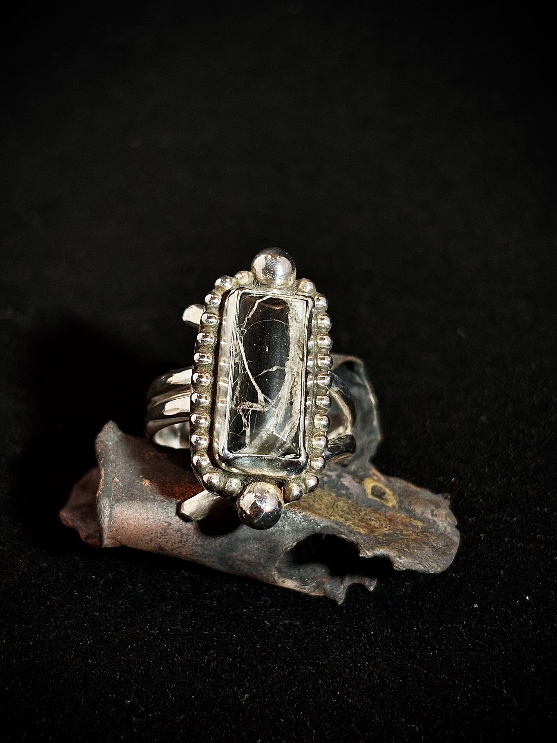 White Buffalo stone set in Sterling Silver. Approximately 26mm x 13mm. Sterling band is adjustable, please select size.